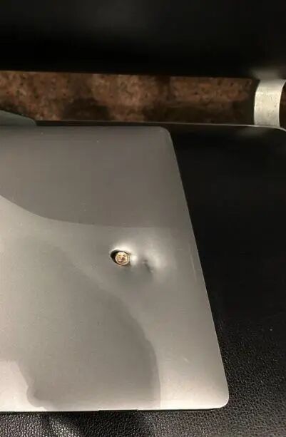 在警局做完笔录后,他打车赶往机场。直到过安检,需要把电脑拿出来时,他才震惊地发现,自己用了五年的笔记本电脑中弹了!